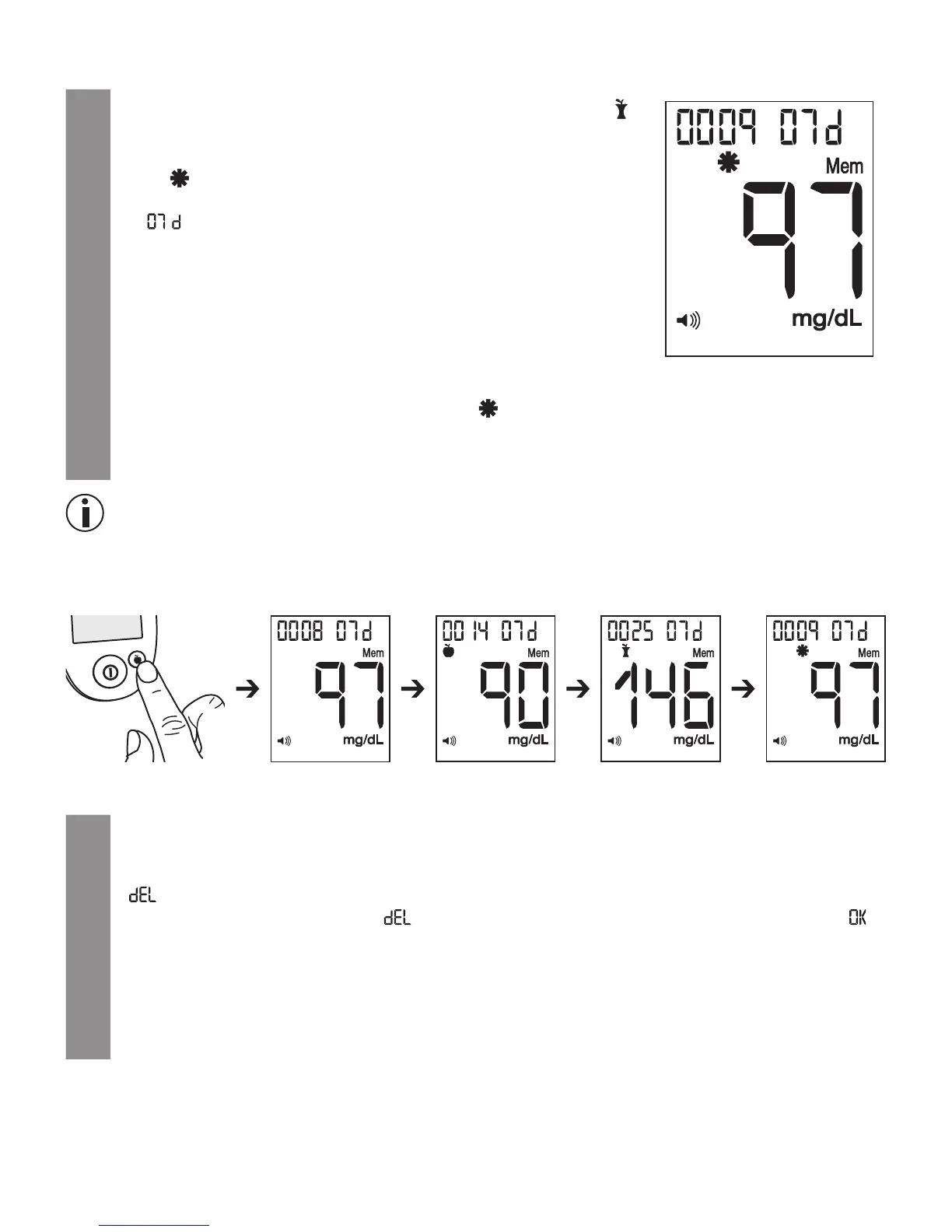 Press “+” [6] repeatedly to display the average blood glucose level from the last 14, 30 and