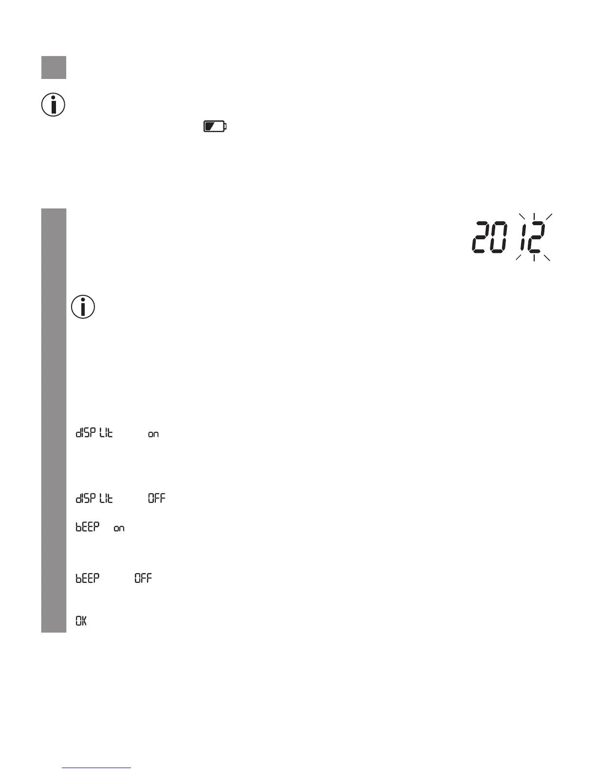 Set the year (calendar to 2099) by pressing the “+” or “–” button. Confirm by pressing the ON/