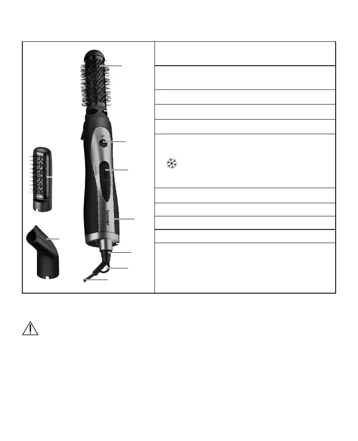 • The round brush [1], the heated brush [2], the nozzle [3] and the device may become very hot