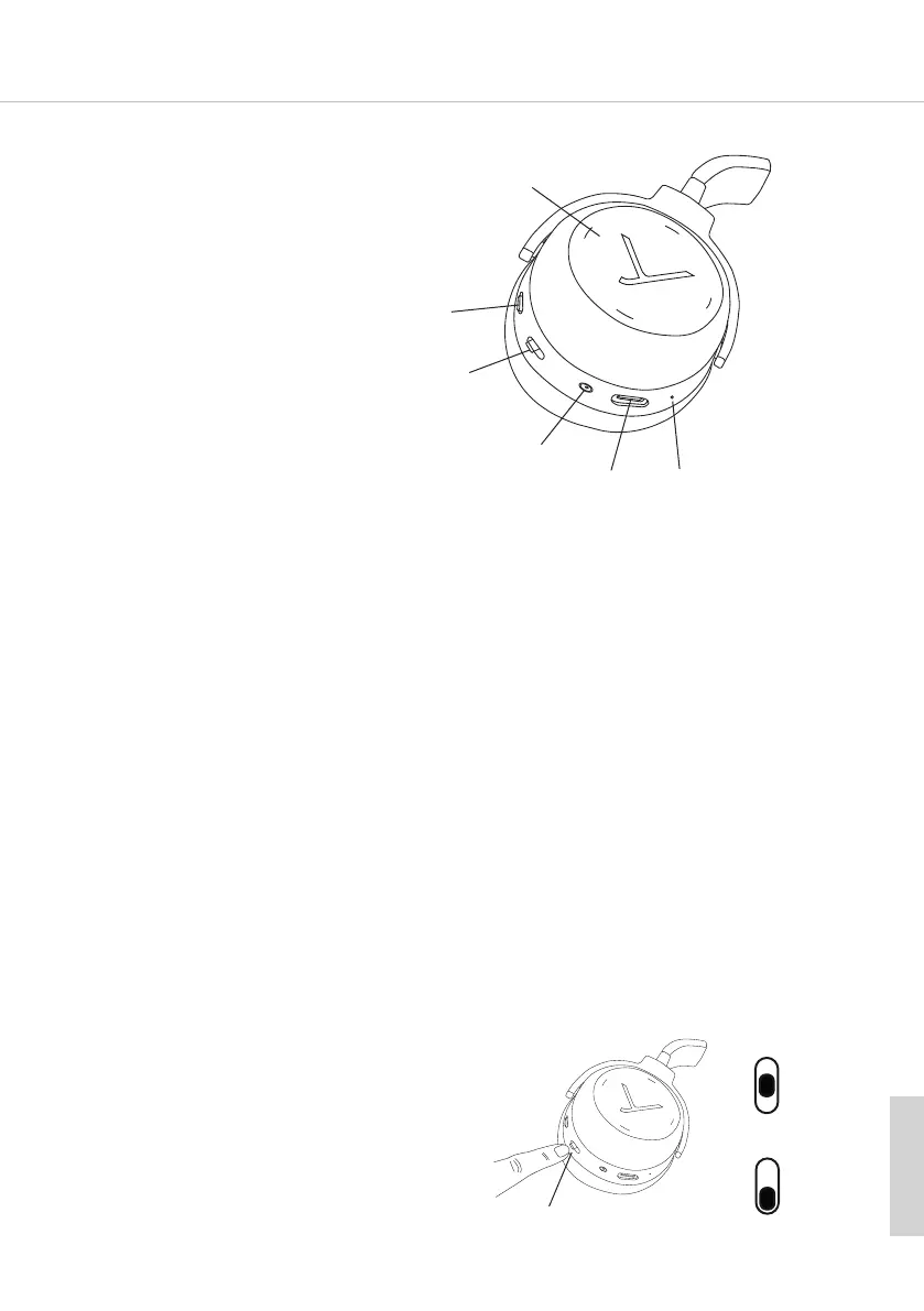 •ヘッドホンを手にするとすぐに右側のハウジングは赤く、左側のハウジングは白く点灯します。