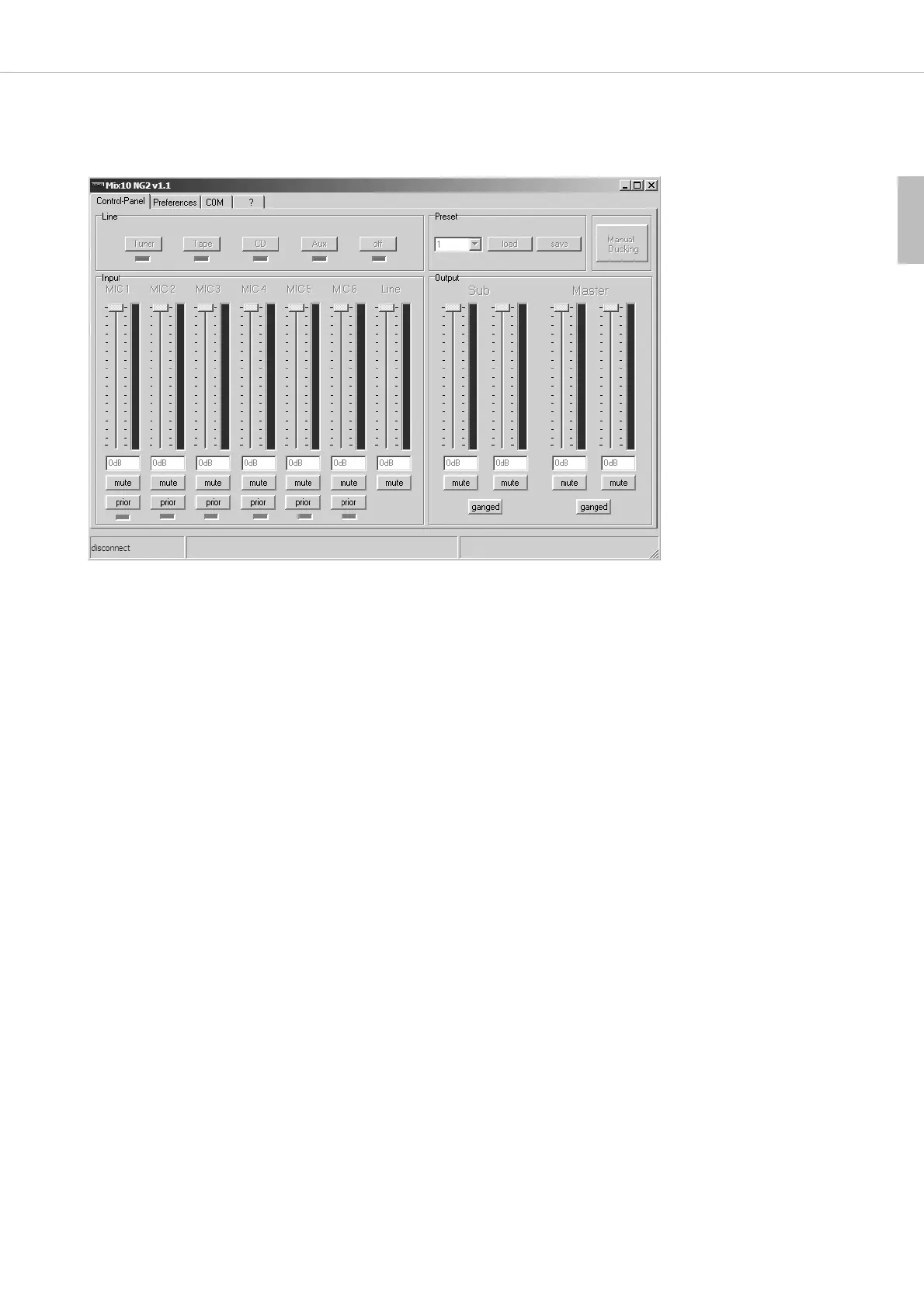 There is one fader and mute button for each input channel. In addition to that, the microphone input channels provide a “Prior” button and