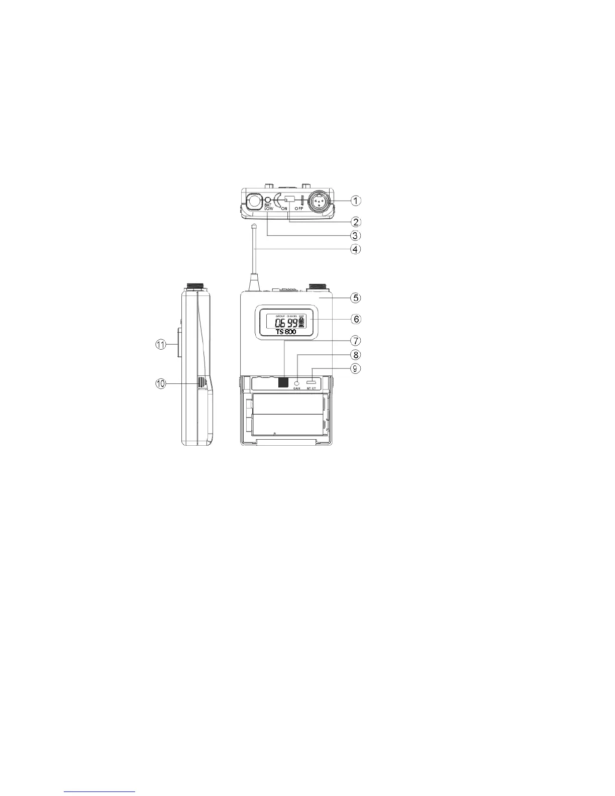 (1) Prise d’entrée BF, connecteur à 4 pôles pour micro-cravate ou set pour tête. Il y a 5 affec-