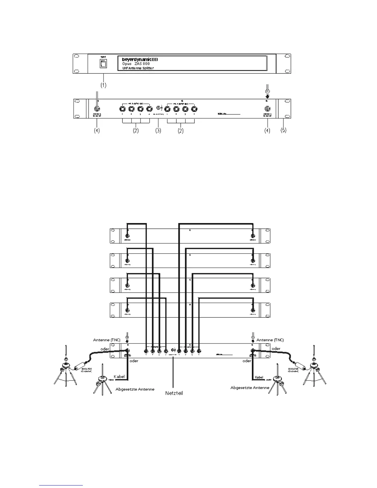 1. Mount the ZAS 800 antenna splitter and the receivers into a 19" rack by using the
