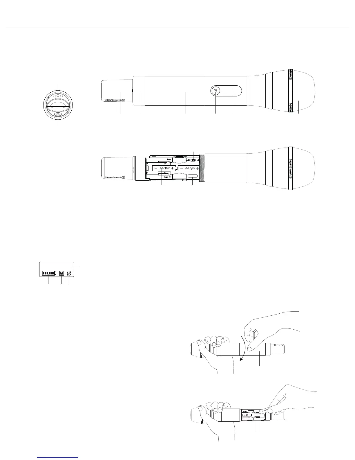 • Insert two alkaline AA 1.5V batteries or NiMH rechargeable