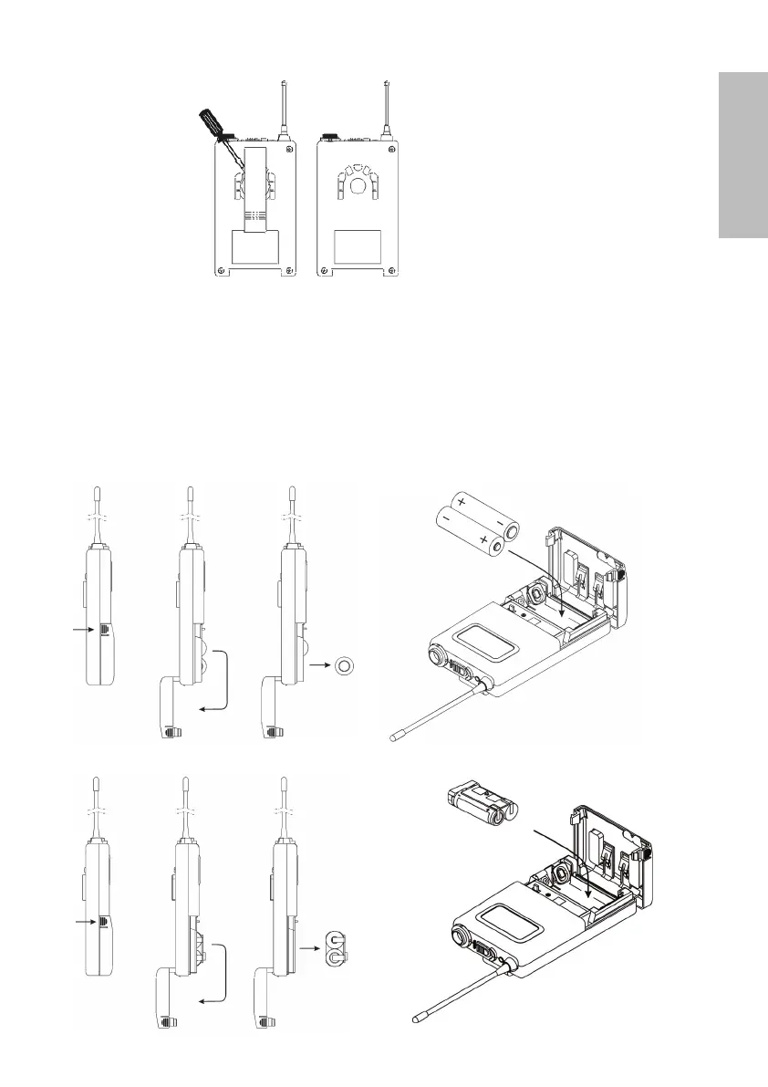 1. Presionar en los puntos de fijación de ambos laterales del compartimento de baterías y ábralo.
