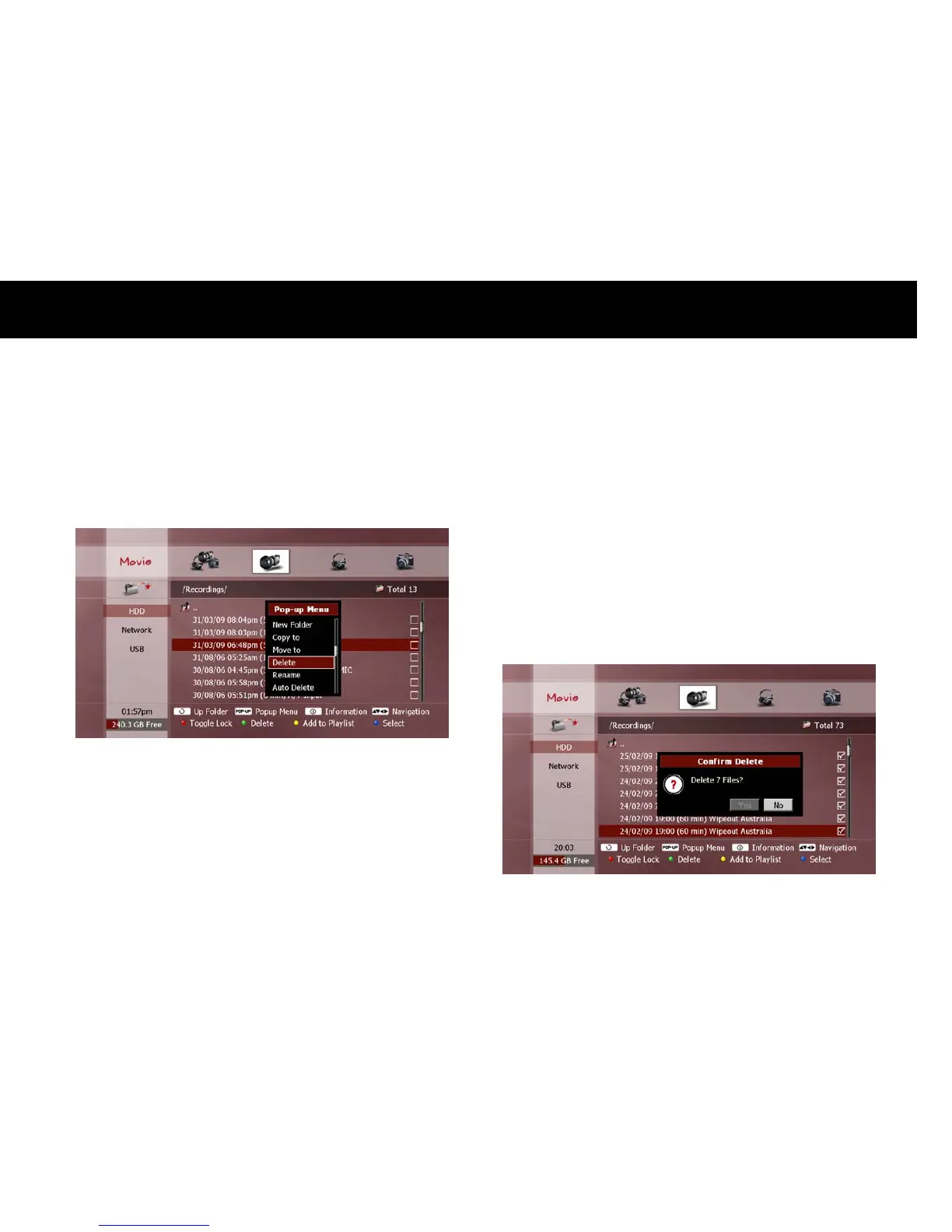 To delete files or folders in a storage device, select the unwanted file(s)