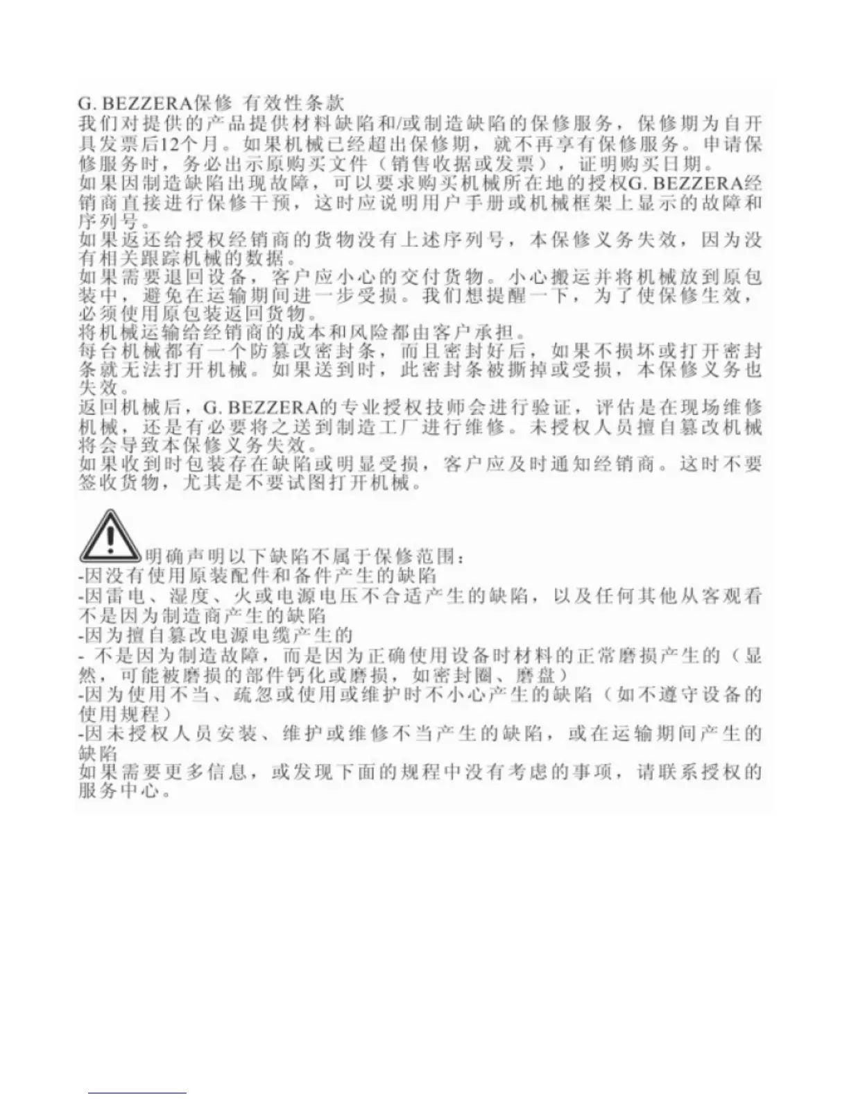 Bezzera B2013 - Warranty Conditions (ZH); Warranty Exclusions (ZH)