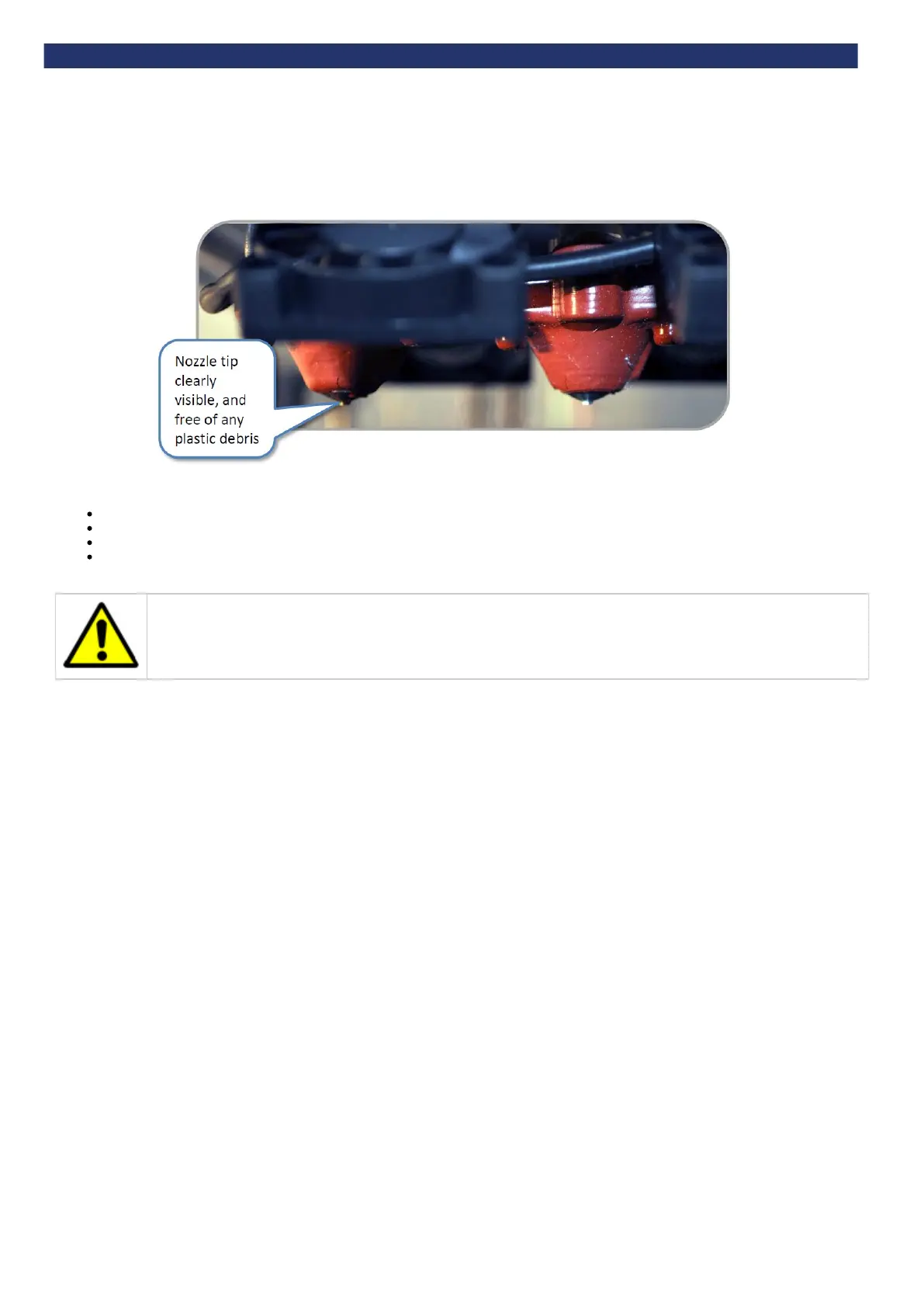 Ensure that the metal nozzle tips are clean from any plastic debris. All tips should be clearly visible.