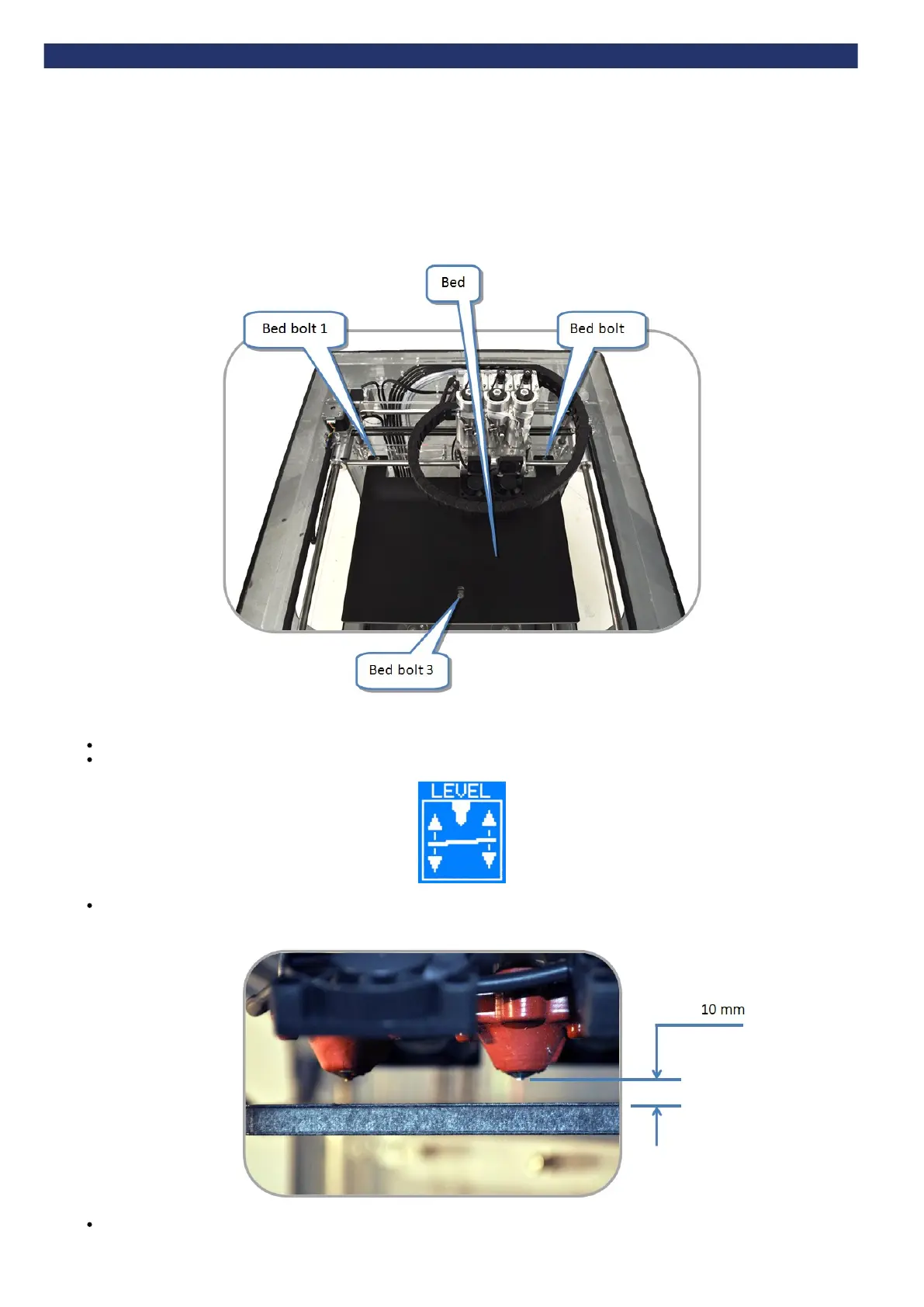 The 'Level Bed' function moves the extruder carriage around the corners of the bed so the operator can adjust the bed bolts to achieve a level bed.