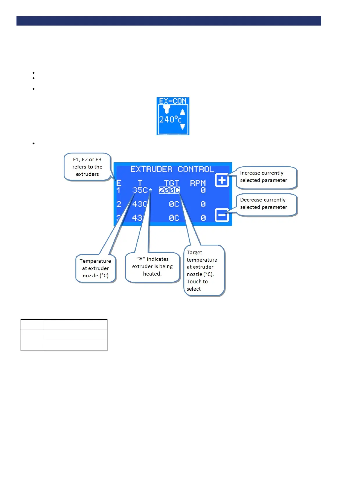 'Extruder control' manages one extruder at a time (E1, E2 or E3) using the buttons on the control panel.