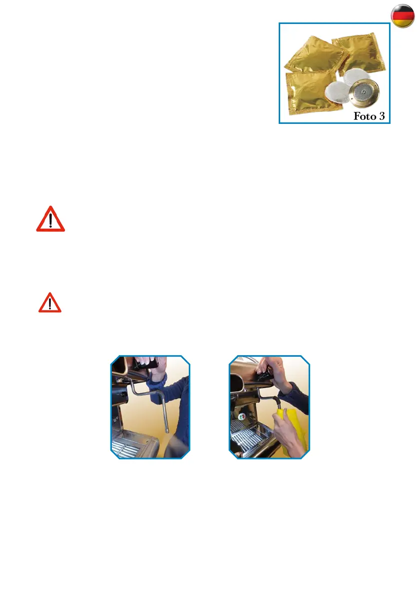 1- Das Blindsieb in den Siebträger einsetzen und das Reinigungsmittel, in der auf der Packung ange-