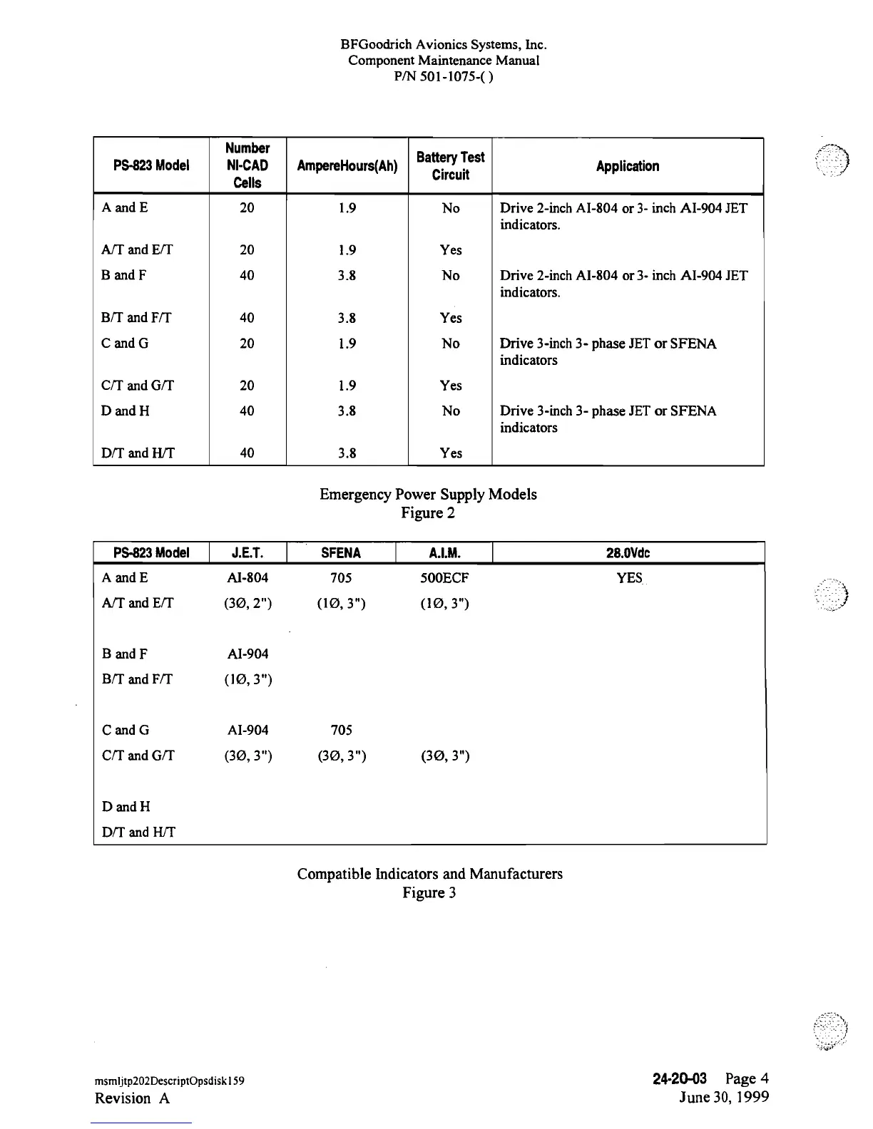 BFGoodrich PS-823 - Emergency Power Supply Models; Compatible Indicators and Manufacturers