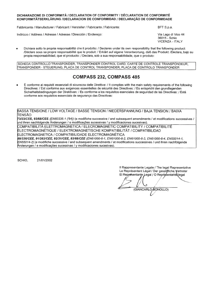 BFT COMPASS 485 - Declaration of Conformity; Product and Directive Compliance