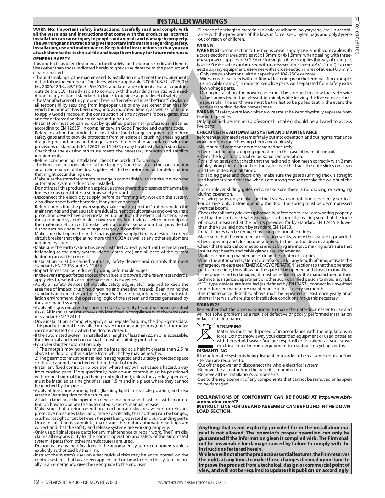 DECLARATIONS OF CONFORMITY CAN BE FOUND AT http://www.bft-