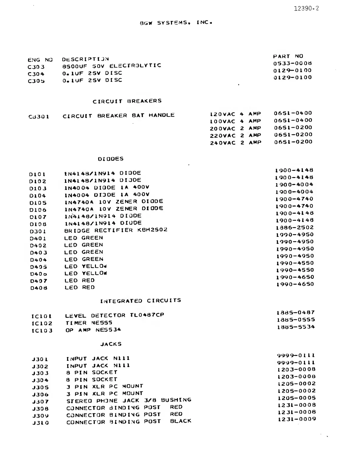 BGW 150 - Parts List - Diodes, ICs, Jacks; Diodes and Bridge Rectifiers; Integrated Circuits; Jacks and Sockets