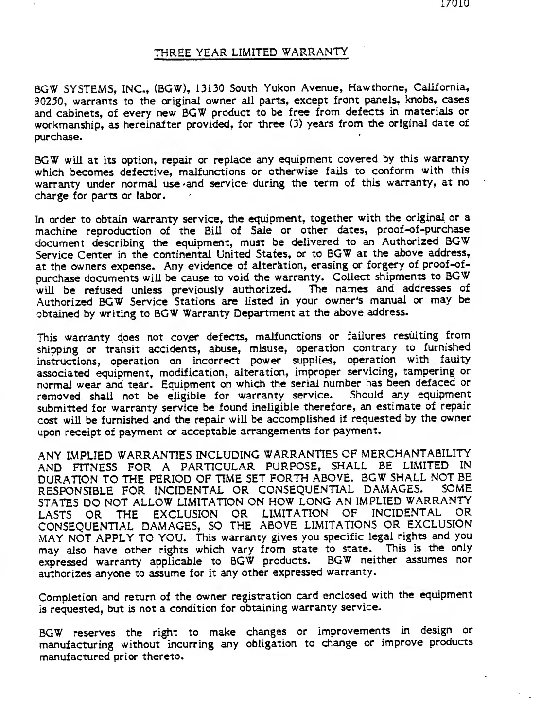 BGW 150 - Limited Warranty Information; Warranty Coverage and Service; Warranty Limitations and Legal Rights