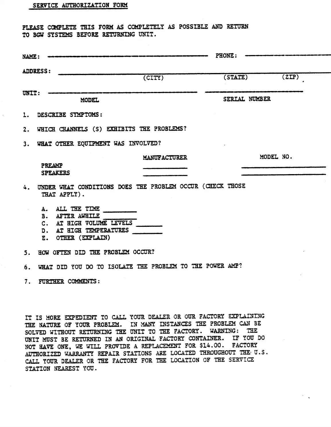BGW 620 - Service and Support Information; Service Authorization Form