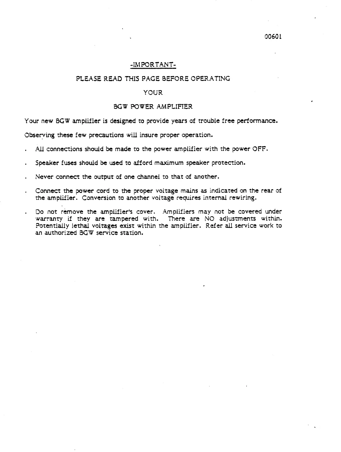 BGW 620 - Important Safety Precautions; Pre-Operation Safety Check