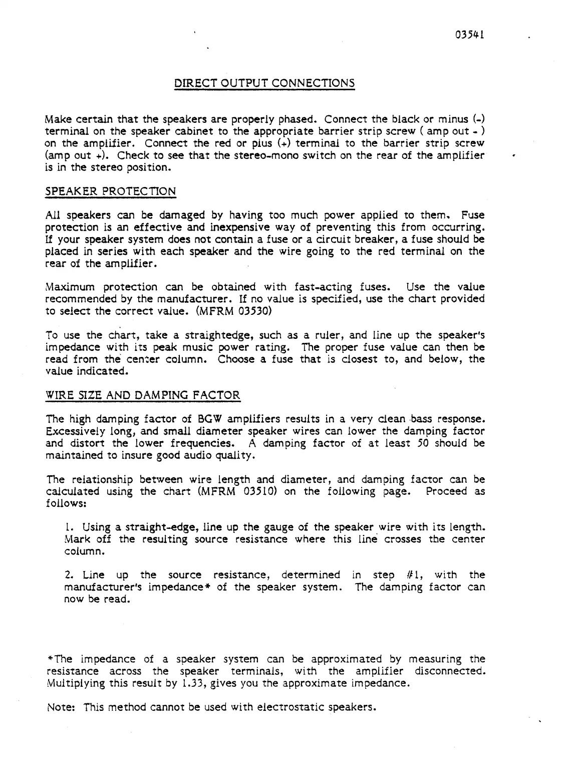 BGW 620 - Output Connections and Speaker Management; Direct Output Connections; Speaker Protection and Wiring
