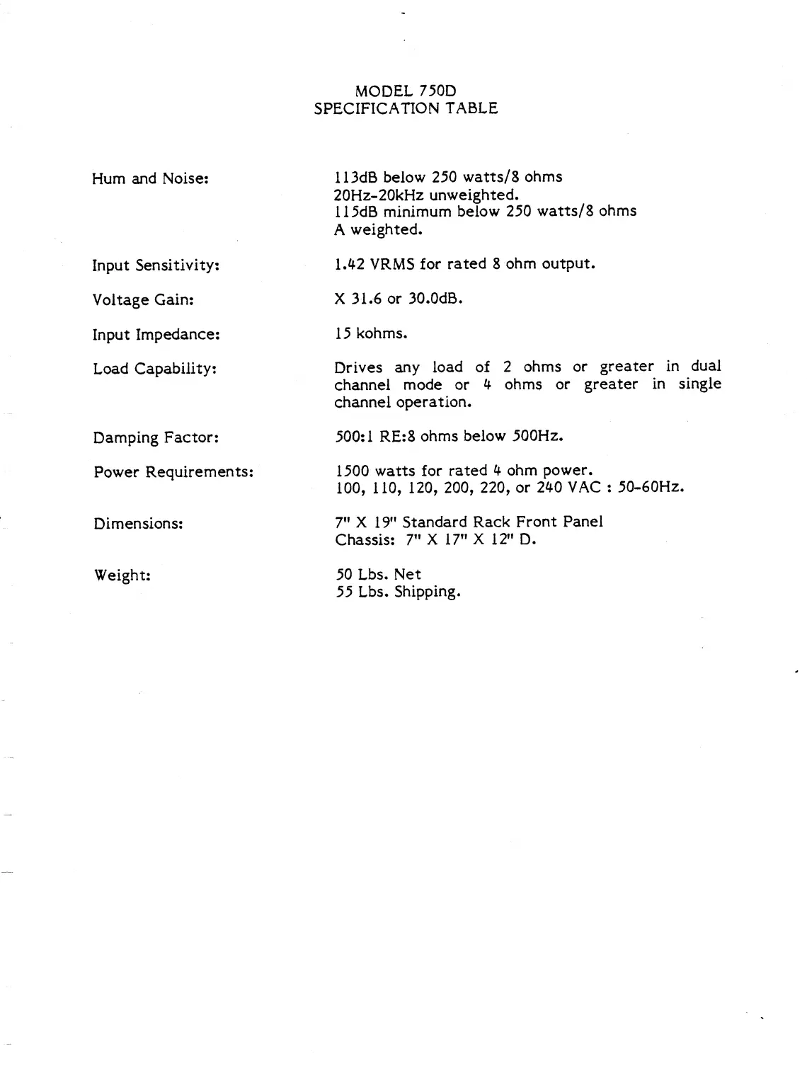 BGW 750E - Model 750 D Specifications; Detailed Specification Table