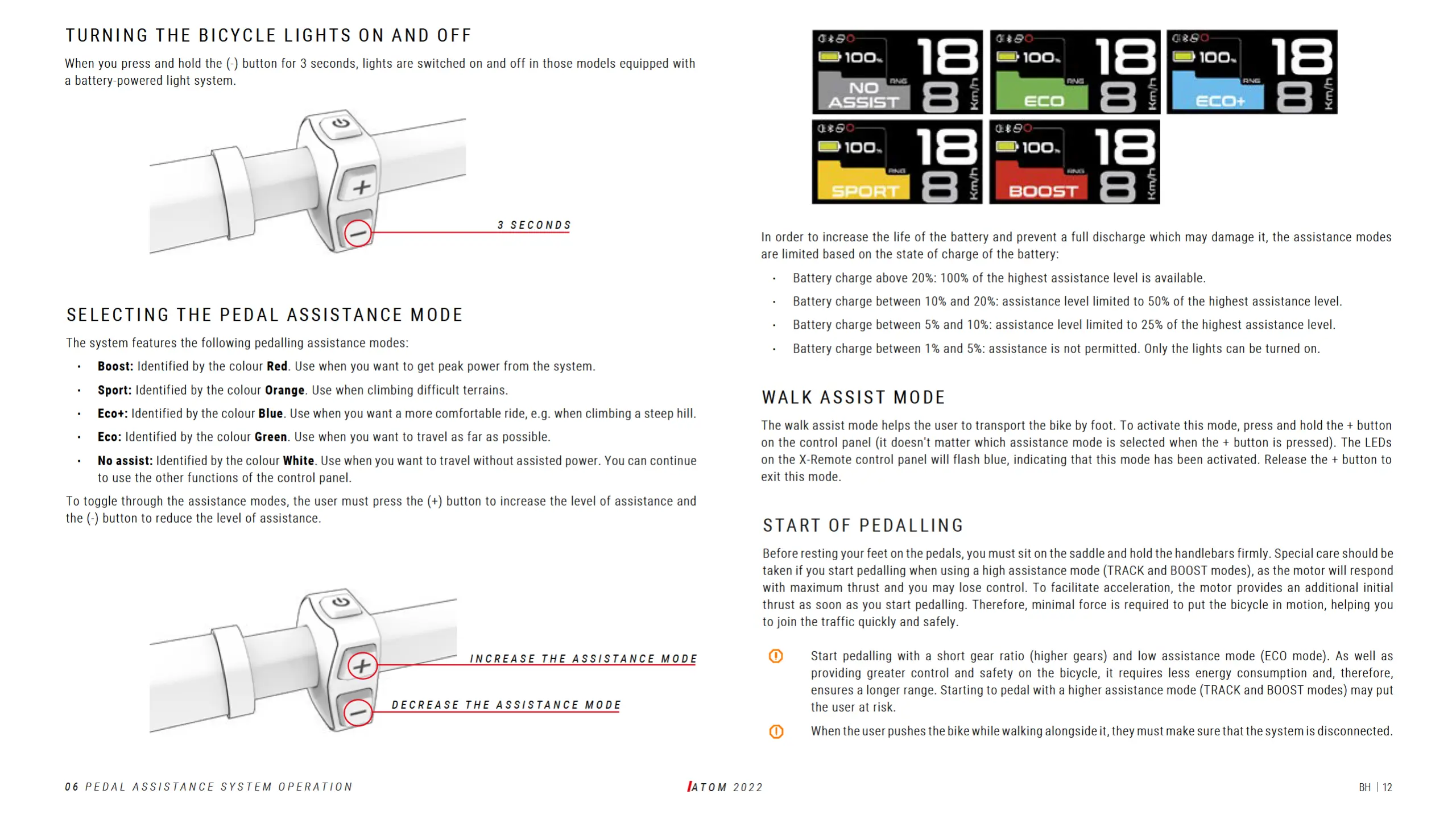 BH ATOM 2022 - Assistance Modes and Riding Features; Bicycle Lights and Pedalling Start