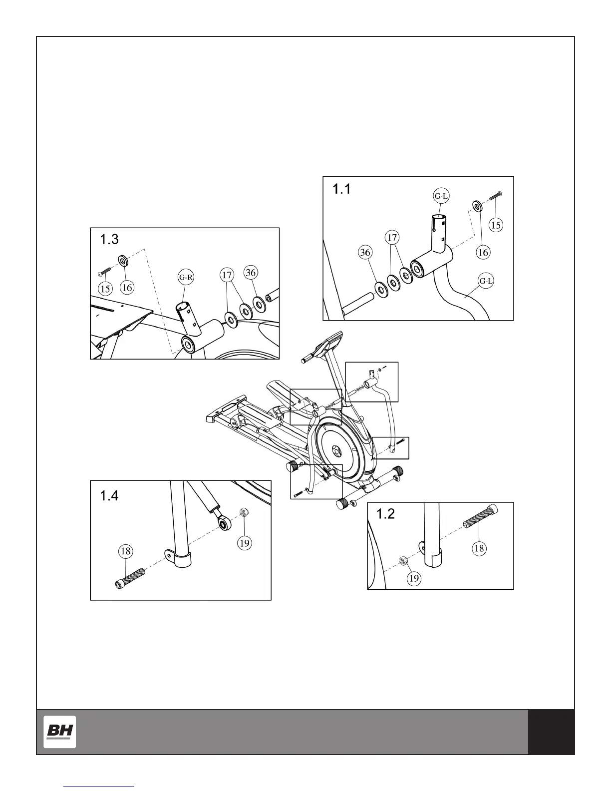 Attach the left Arm (G-L) to the upper control tube with Screws (15, 16), Washer (36), and