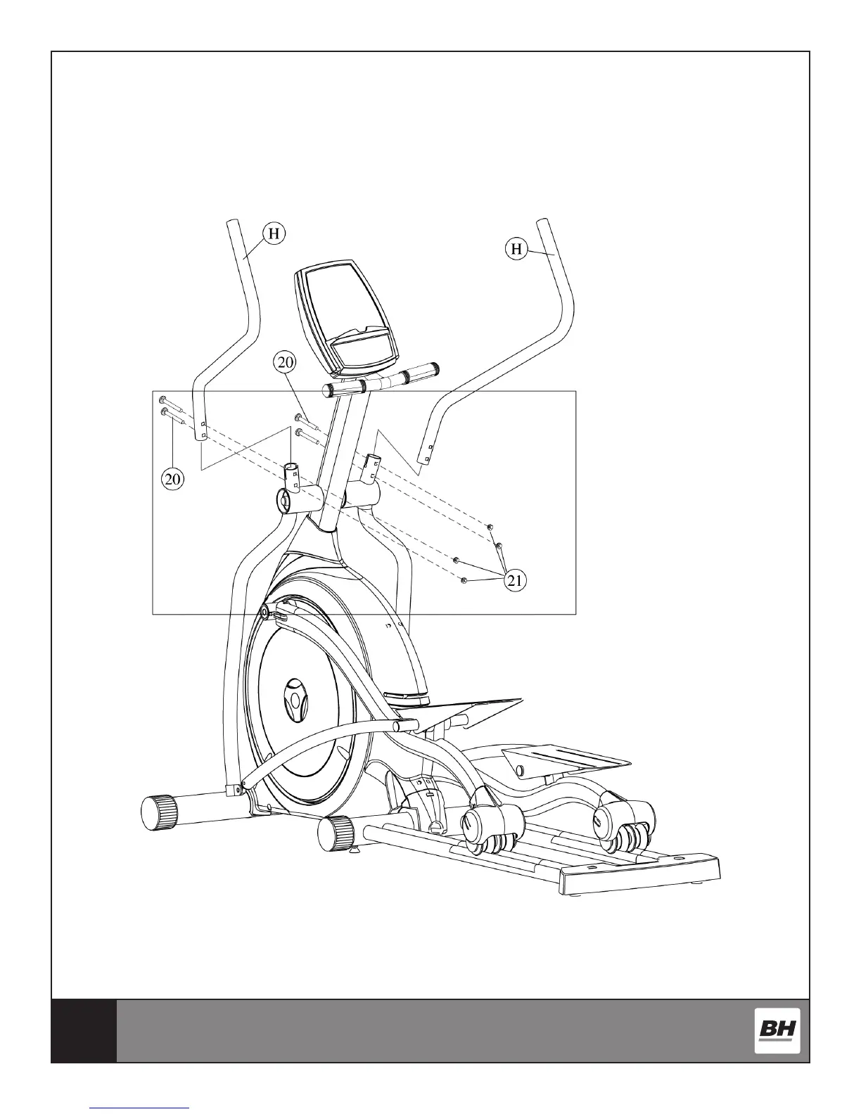 Attach the Handles (H) to the top part of the arms and tighten with Screws (20, 21).