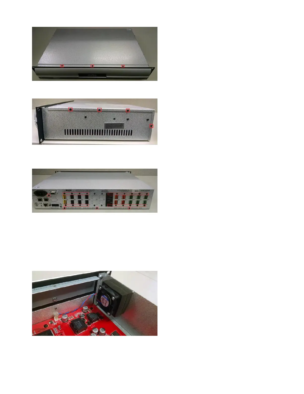 5. Remove the three screws along the bottom edge of the rear panel. Remove the screw between the power jack