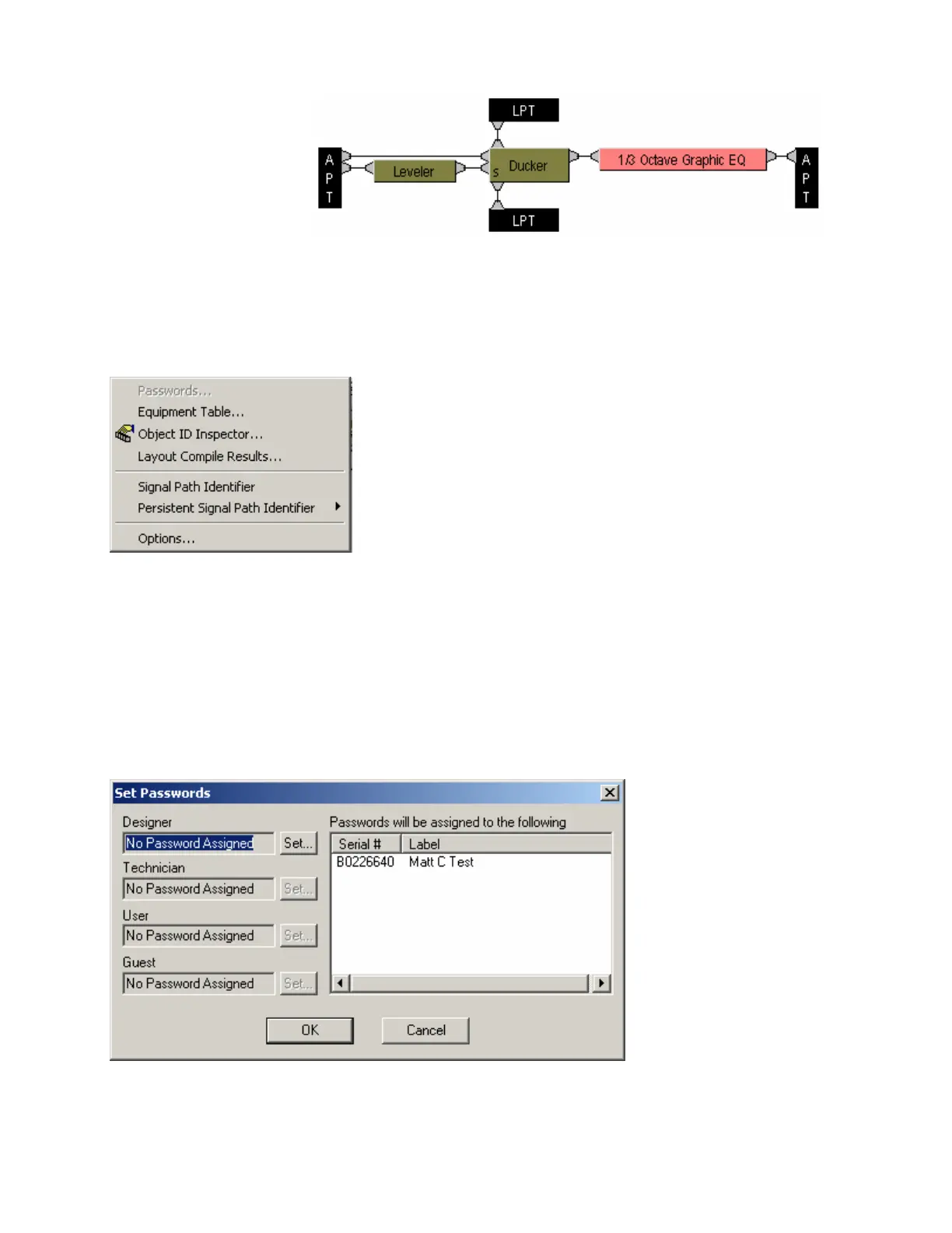 Provides the Set Passwords dialog box, for establishing password protection in selected Audia
