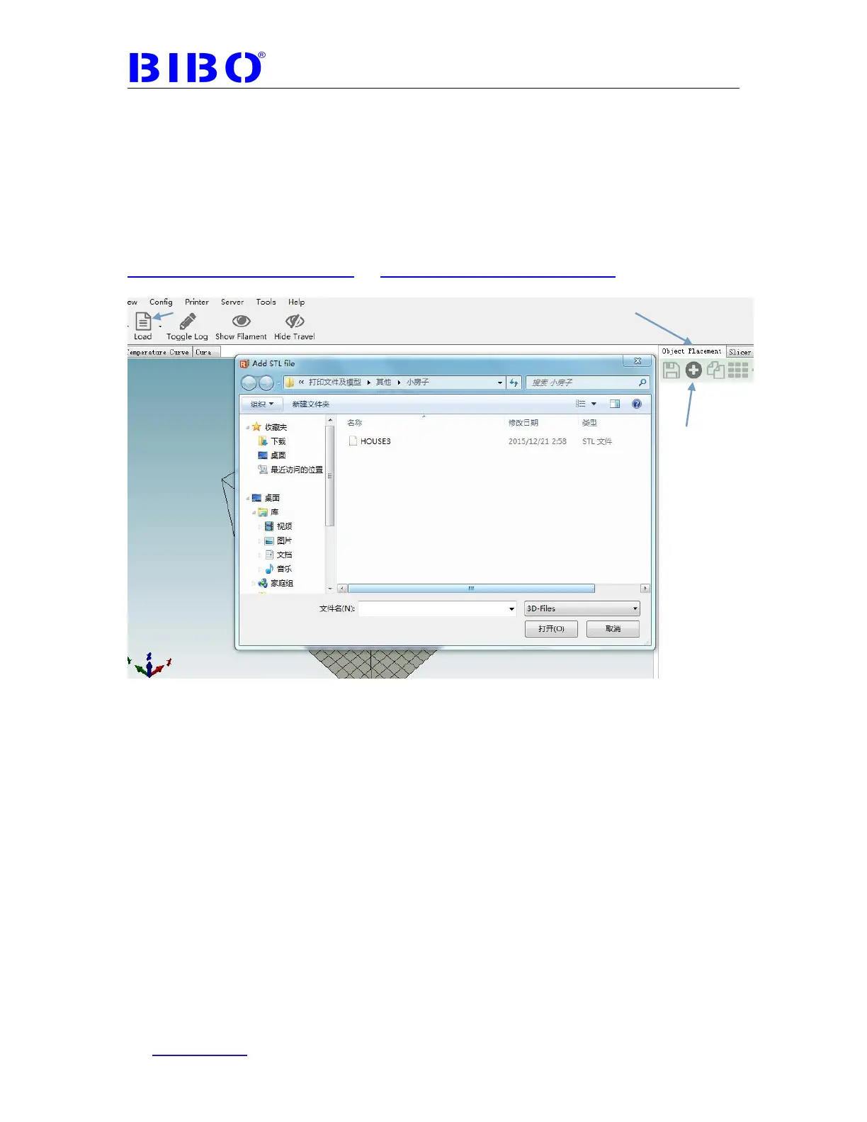 “Load” in the left or “+” in the right. Then choose the object you want to print.