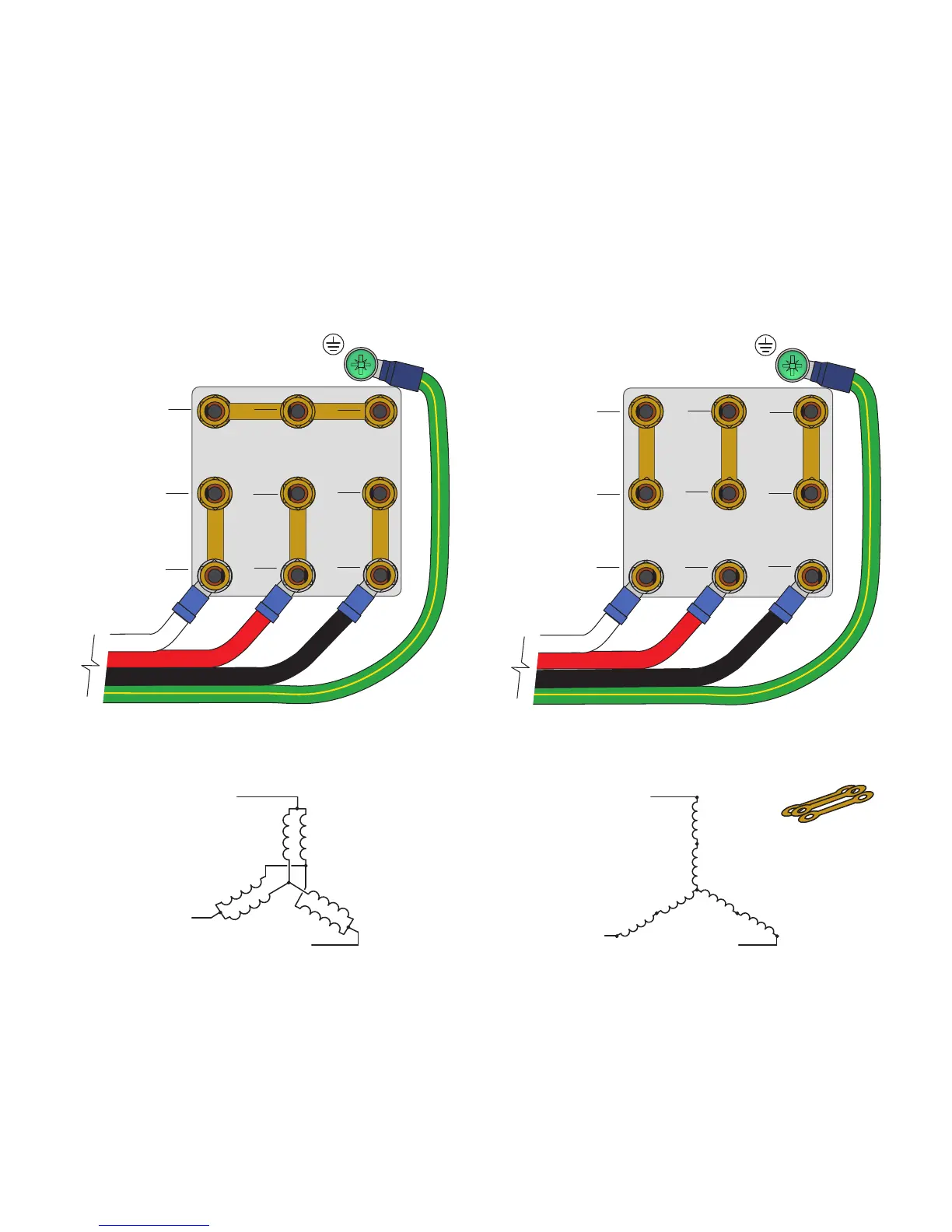 The motor wiring configurations shown below are applicable to 9-lead, dual voltage, wye wound motors rated for