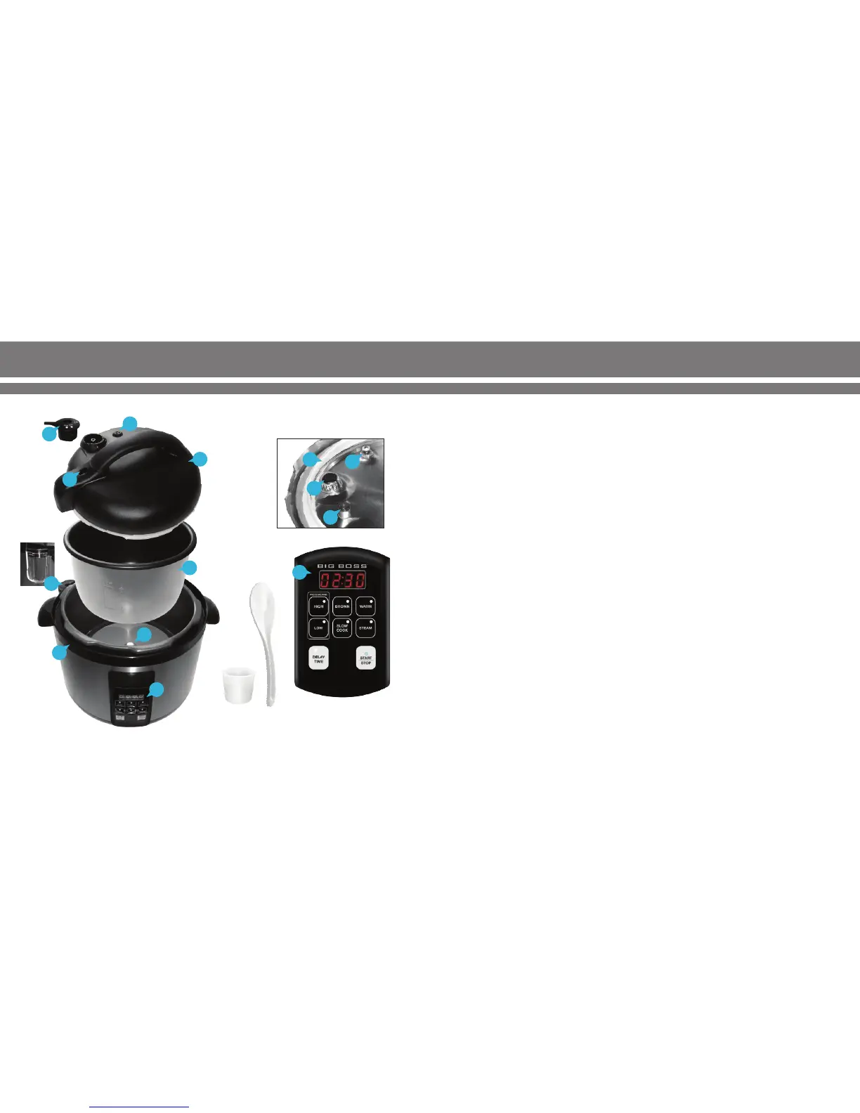 11. Control Panel-includes functions like: High and Low (for pressure cooking), Warm, Brown, Steam, Slow Cook, Delay Time.