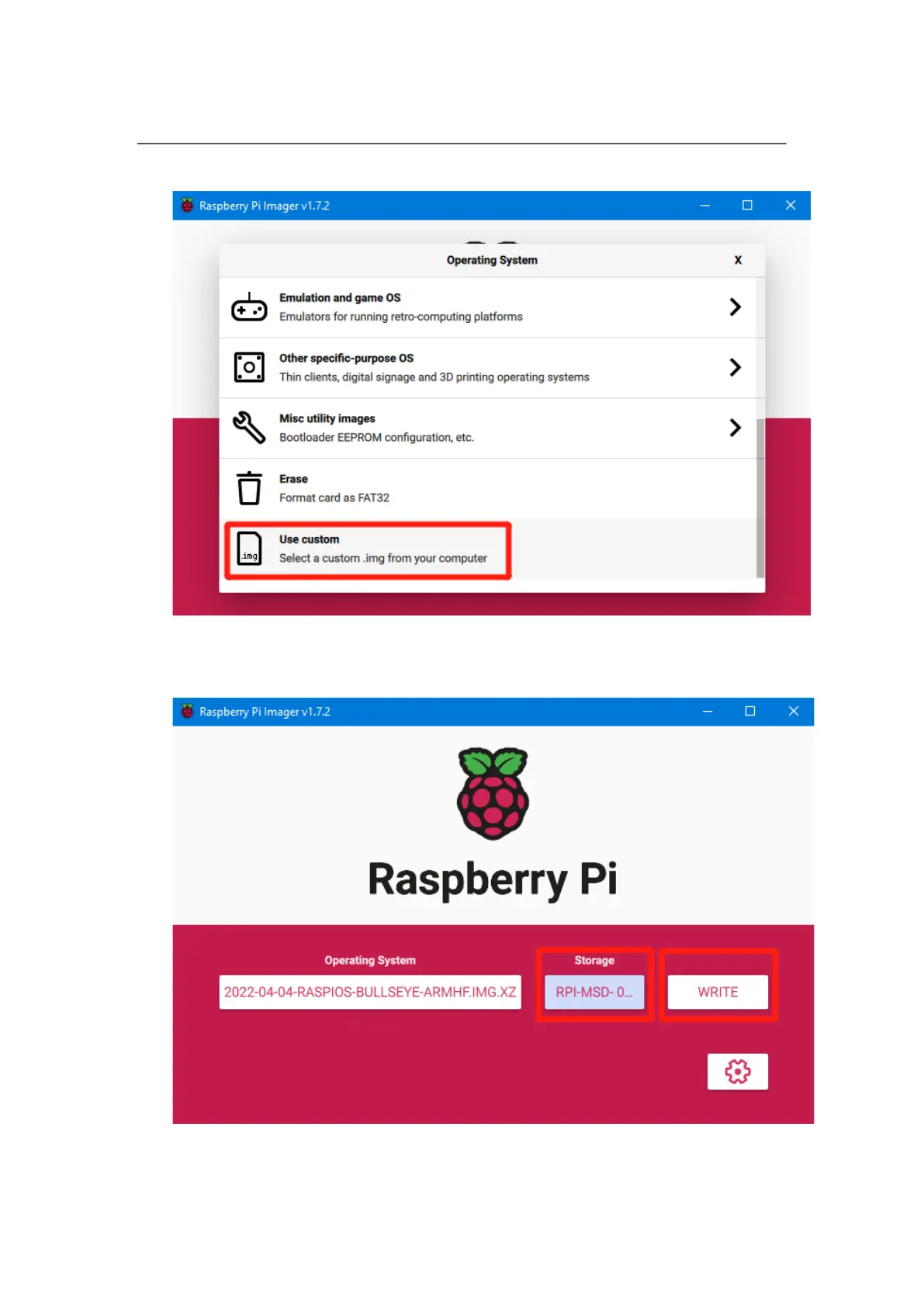 4. Select the microSD card and click "WRITE" (WRITE the image will format the