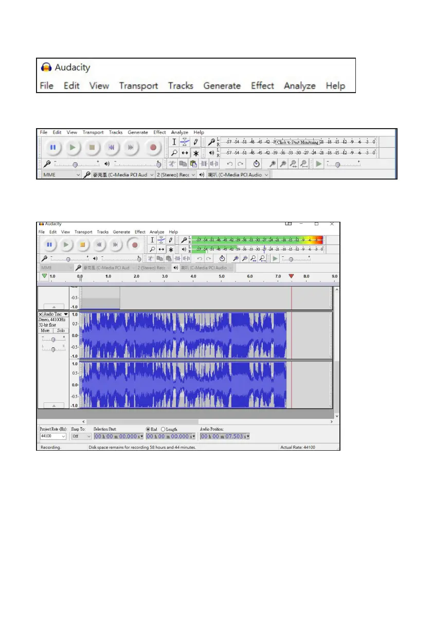 Benutzen Sie oben im Menü der Symbolleiste File, Edit, View, Transport, Tracks, Generate, Effect,
