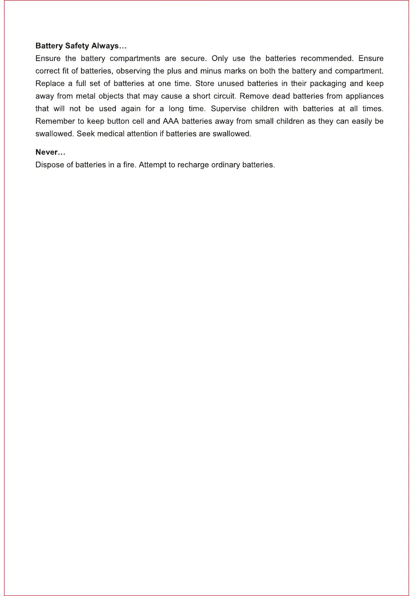 Bigben TW1 - Battery Safety; Never Use Batteries