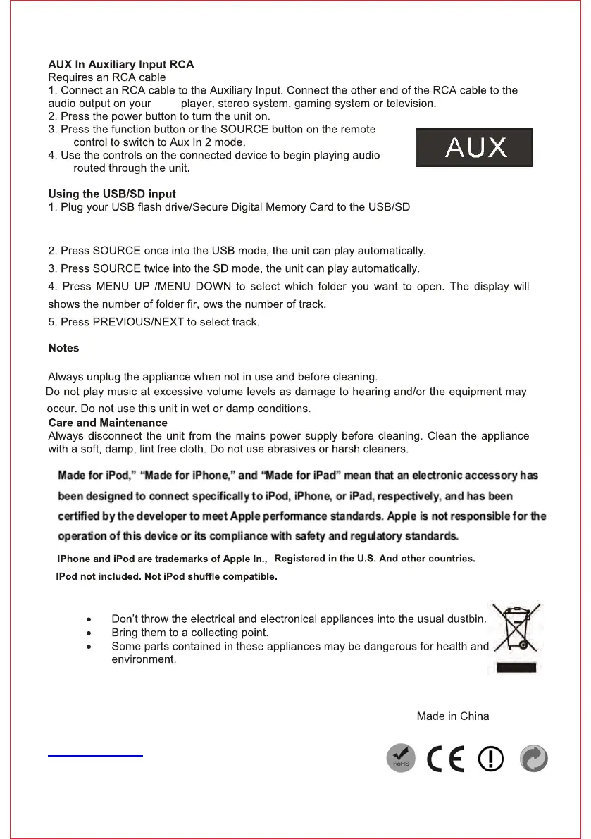Bigben TW1 - AUX Input RCA Connection; Using USB;SD Input; USB;SD Input Notes; Care and Maintenance