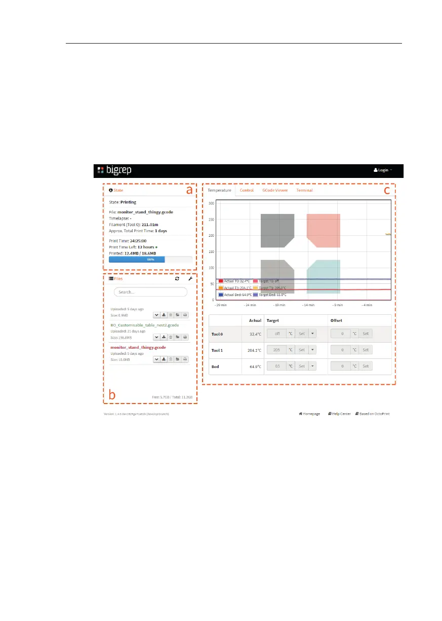 b. Dateioperationen: G-Codes laden und Druck starten.