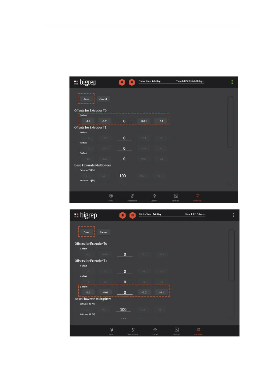 9. Wiederholen Sie die Schritte 3 bis 8 für den Extruder T1. (Siehe Abb. 7-2)