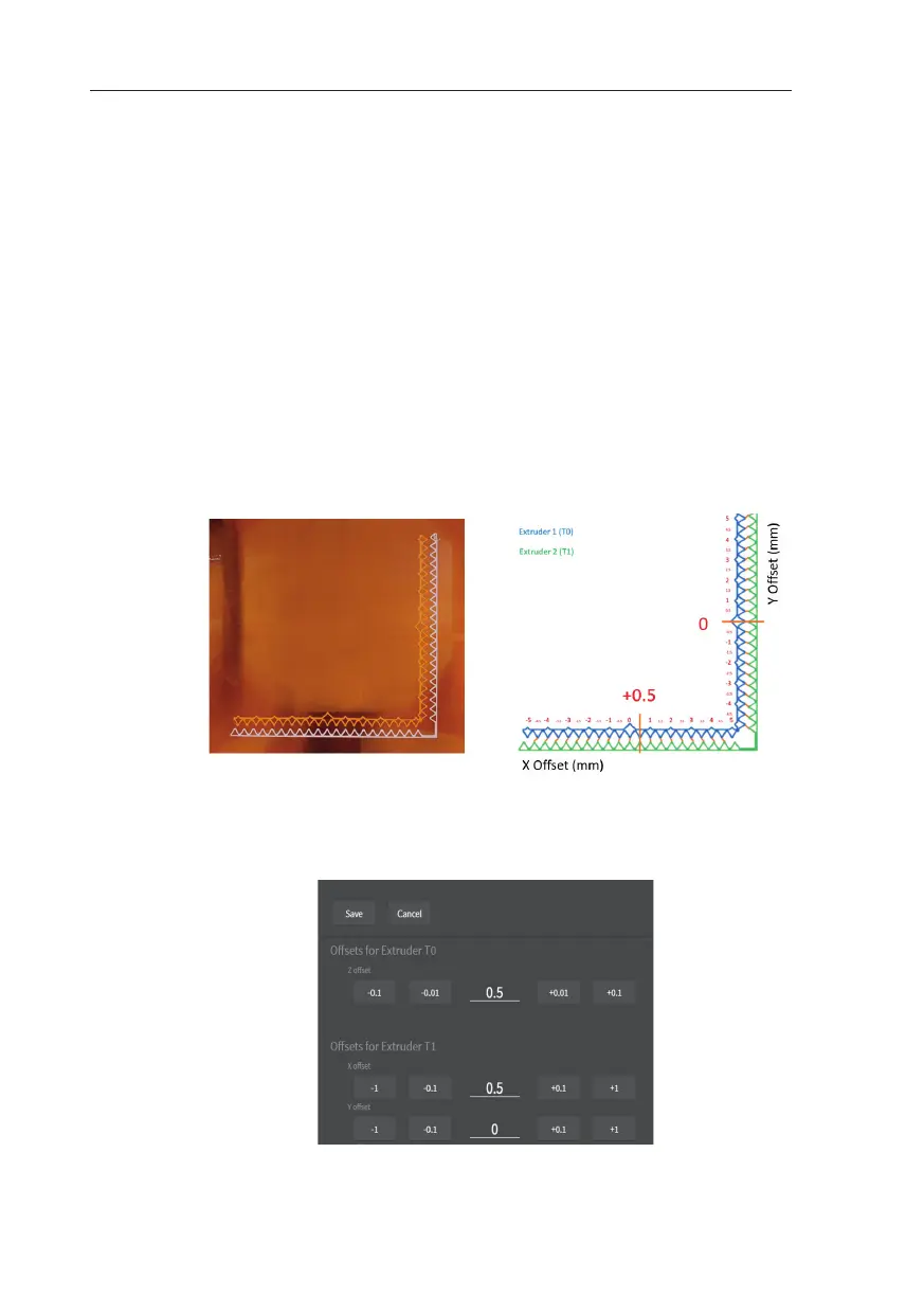 – O sets bestimmen: Die von Extruder T0 und T1 erstellten Muster