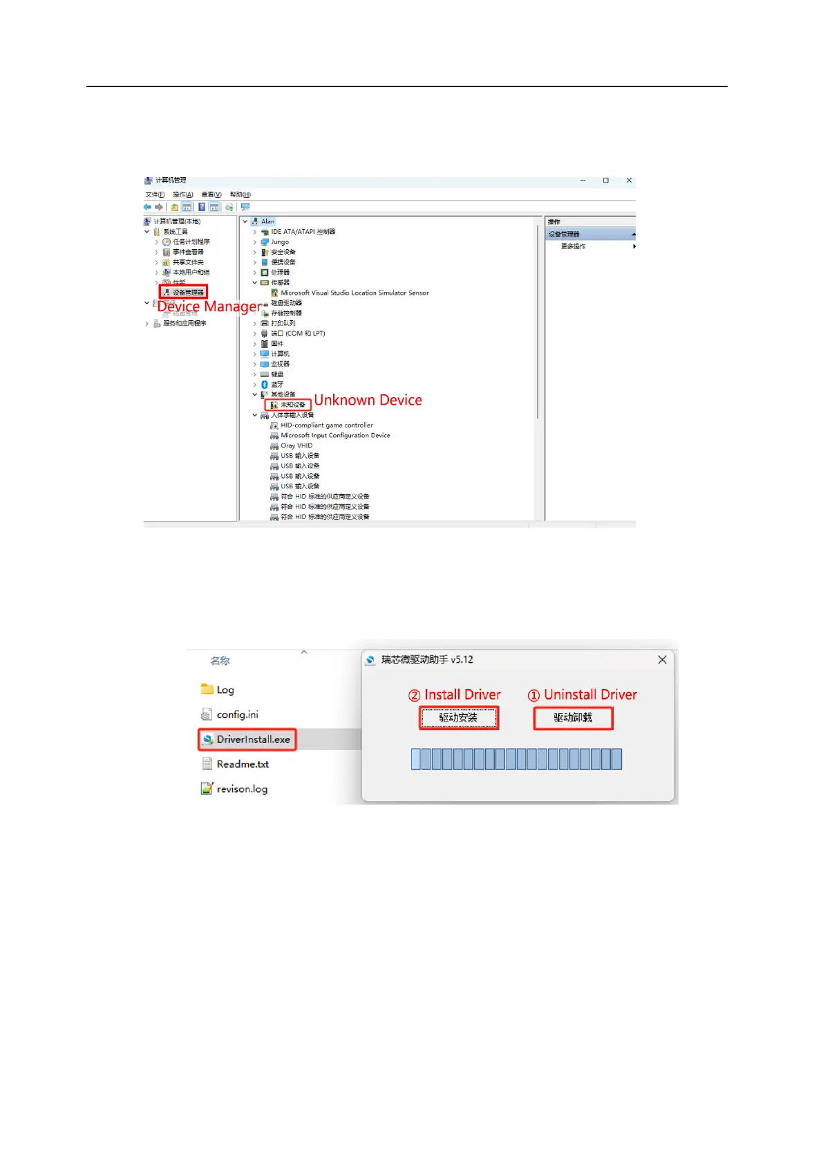 ⑴ In “Device Manager”, if you see “Unknown Device”, it indicates that the