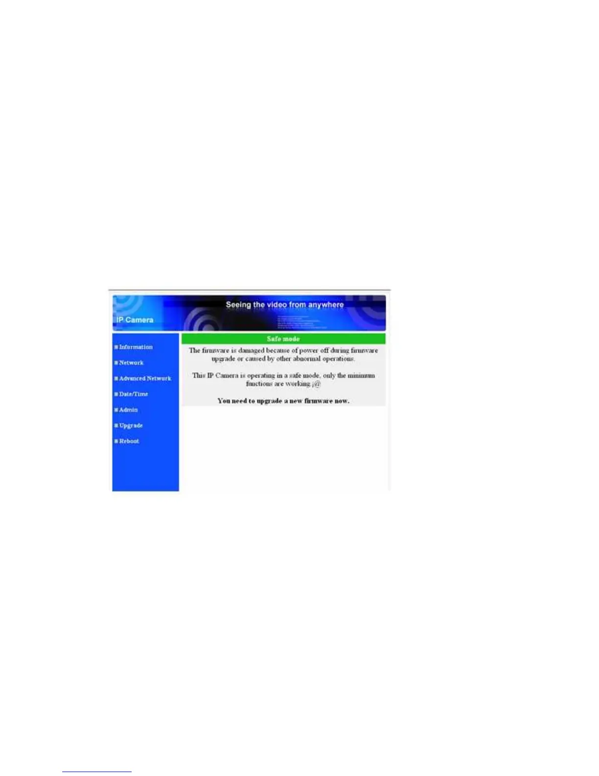 the upgrade procedure, the IP CAM will enter into the safe mode. In this mode, you will