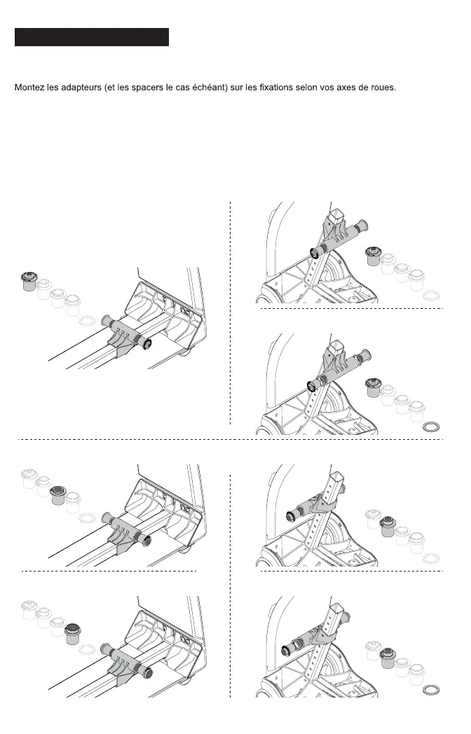 ASSEMBLEZ LES FIXATIONS D’AXES DE ROUES ET LES ADAPTATEURS. / ASSEMBLE WHEELS