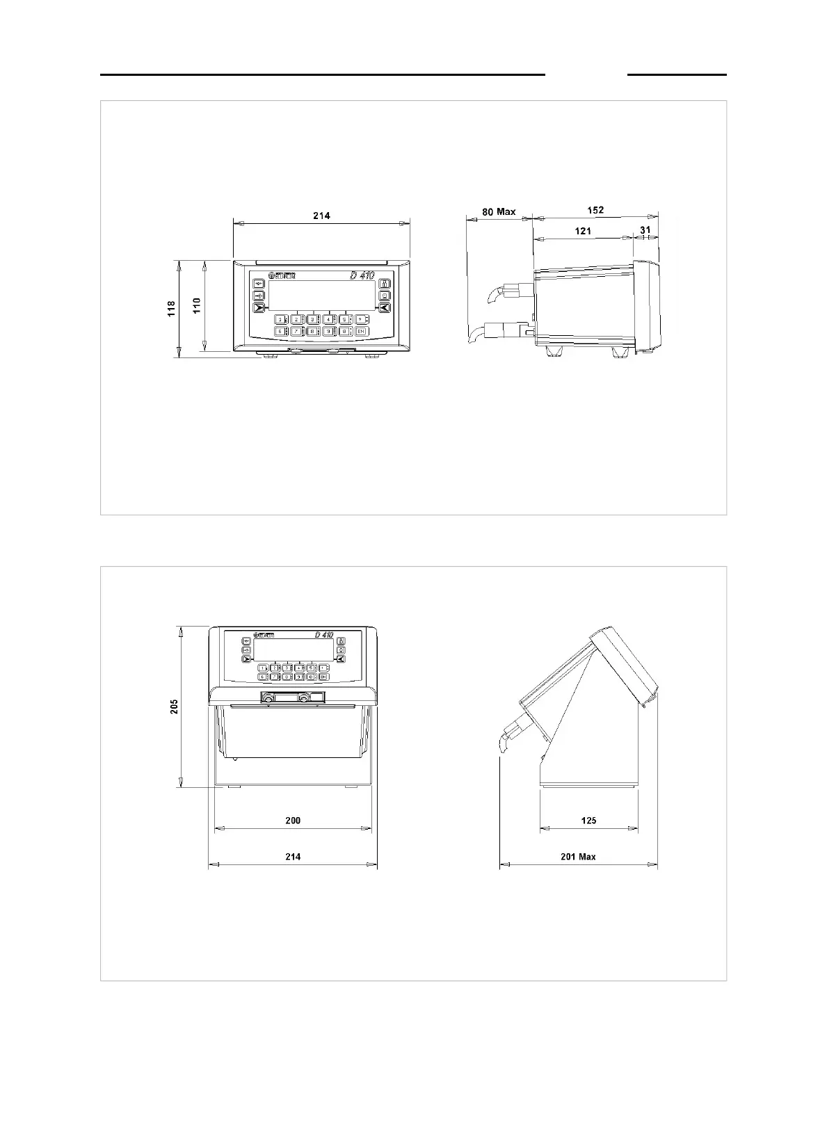 Figure 1.3 - Dimensions and weight of version with tilted support