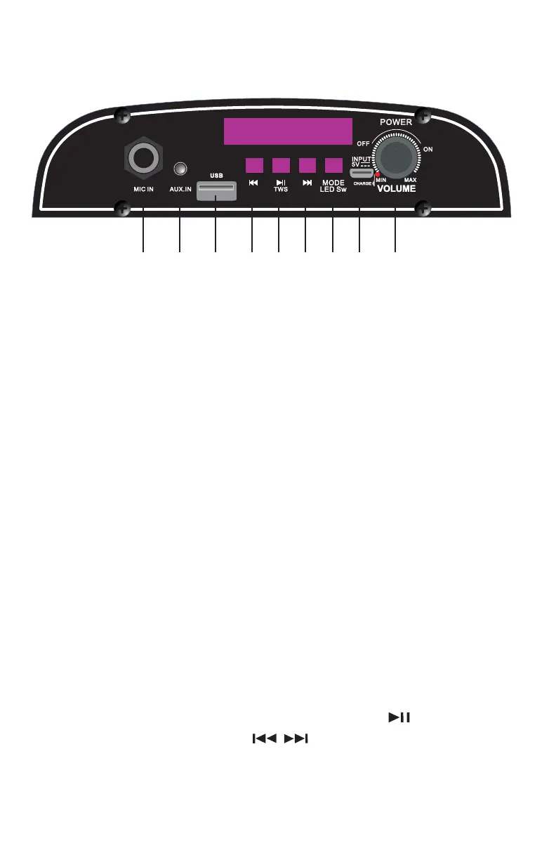 7. MODO / LUZ LED: alterna entre AUX, USB, FM, BT con una pulsación