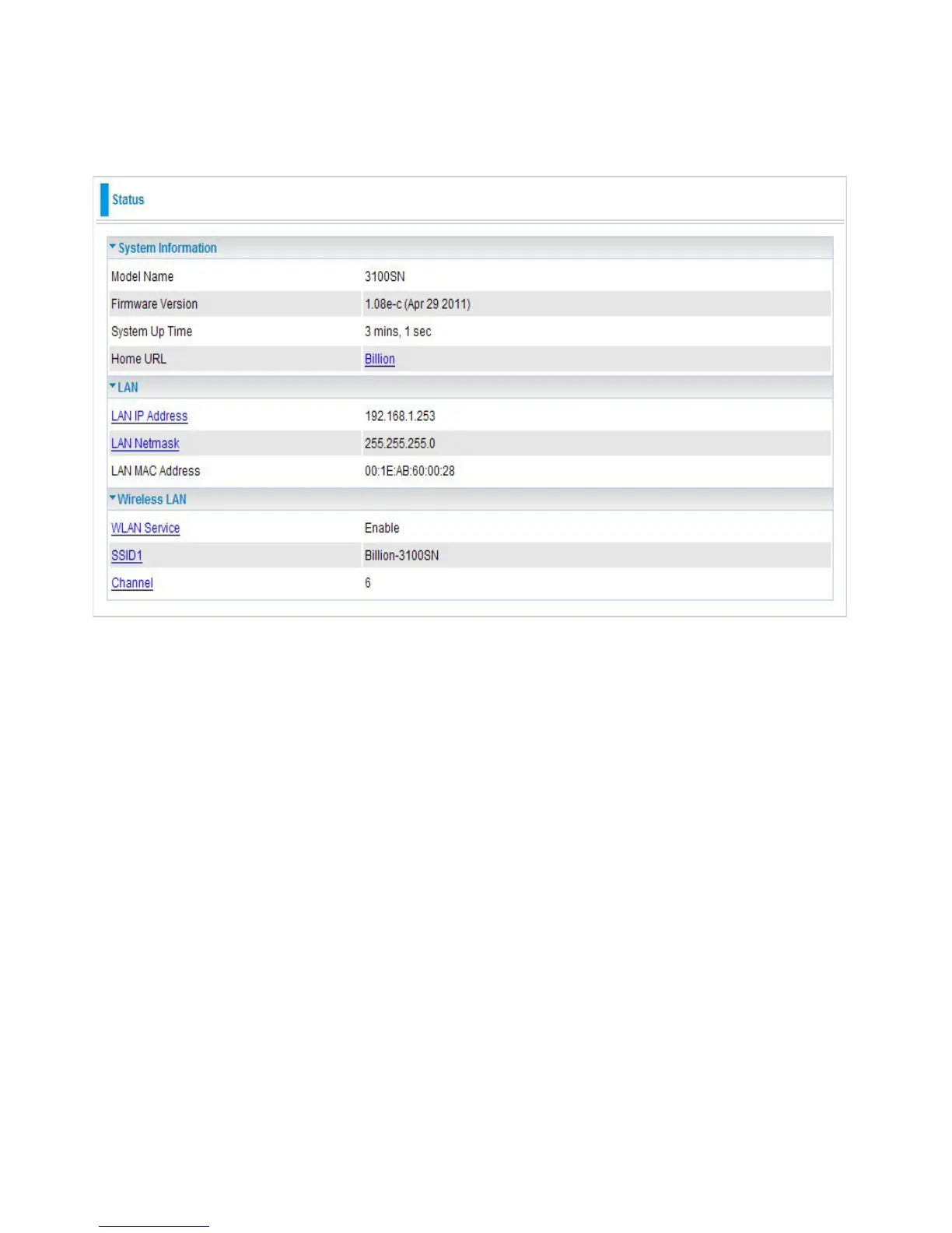 Home URL: Displays the Internet address for vendor. Click to open the home page of Billion website.
