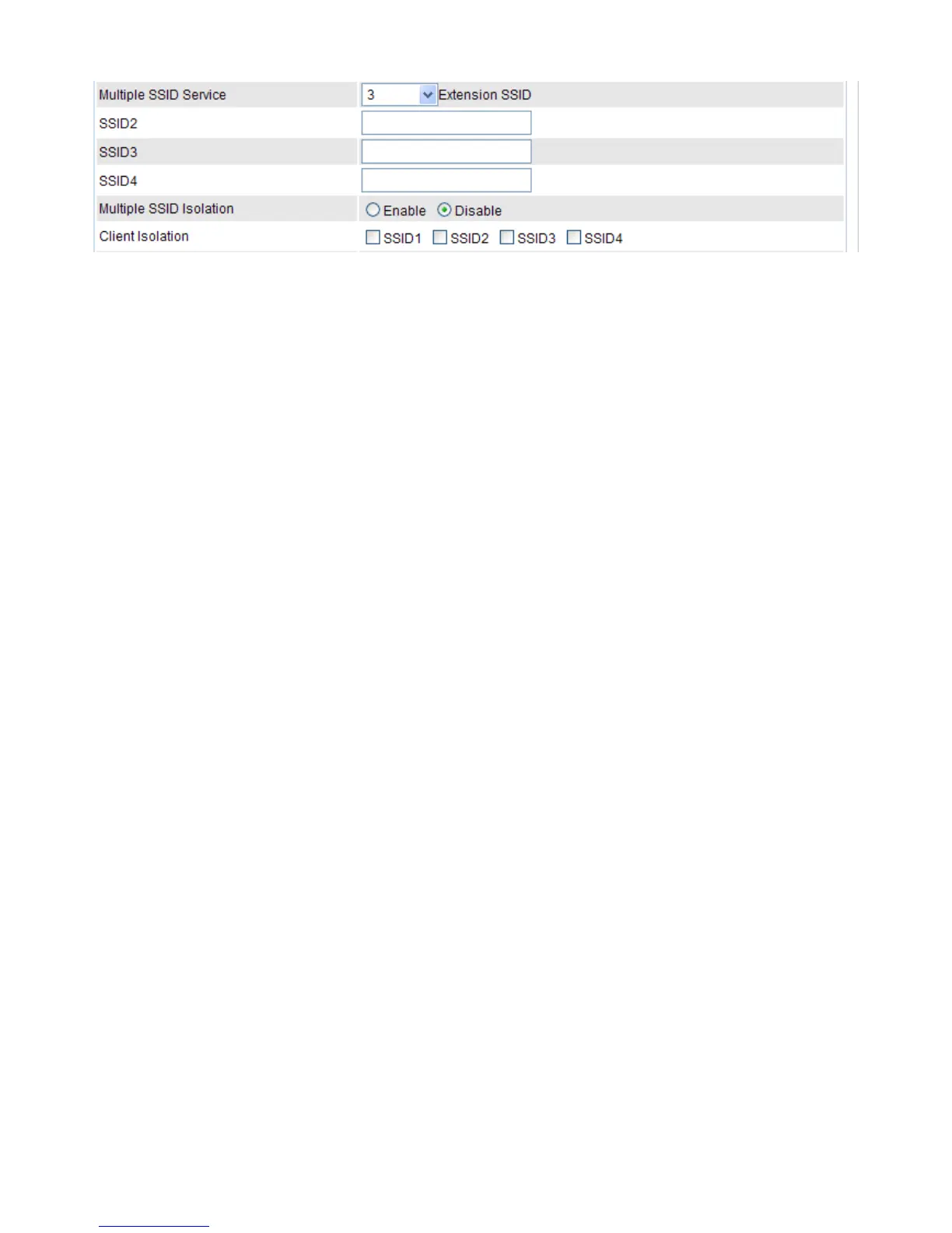 ● Multiple SSID Service: You can select Disable,or 1, 2, 3 Extension SSID to be available at the