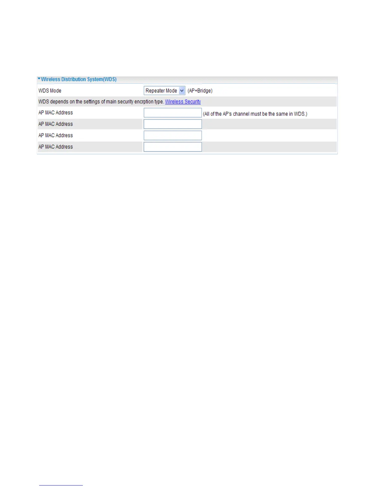 Bridge and Repeater Mode. 4 AP MAC Addresses can be lled simultaneously. it is