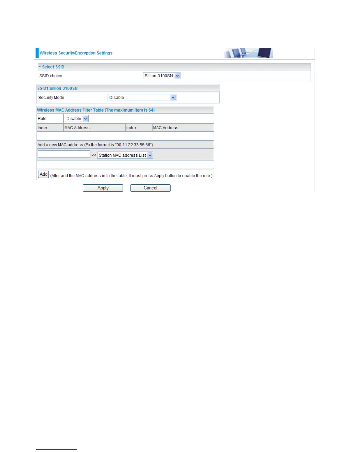 Wireless MAC Address Filter Table (The maximum item is 64)