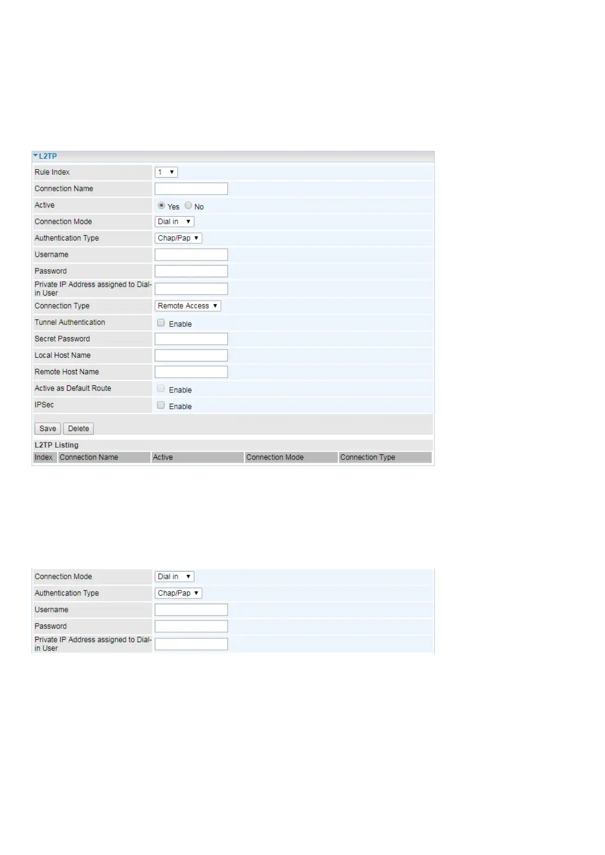 Connection Mode: Select Dial In to operate as a L2TP server.