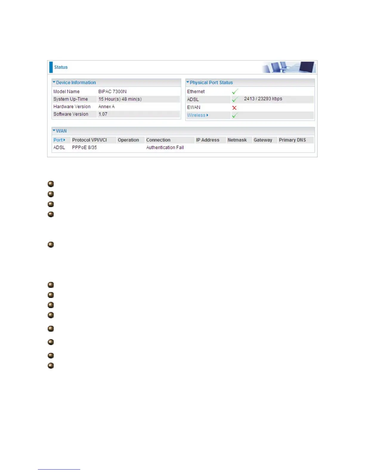 Port Status: User can look up to see if they are connected to Ethernet, ADSL, EWAN or